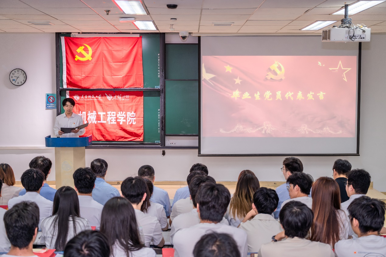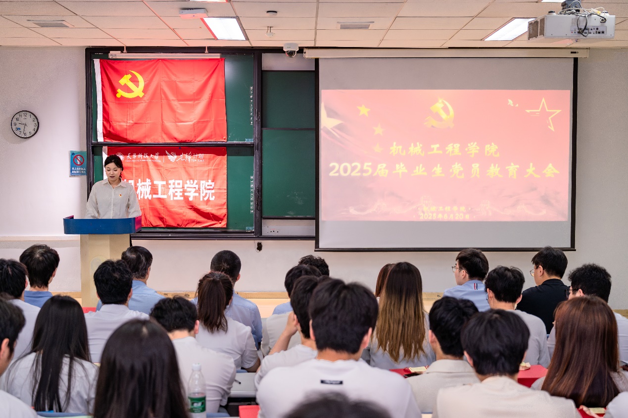 为深入学习习近平新时代中国特色社会主义思想,进一步加强毕业生党员的理想信念和组织纪律,深化党员身份认同感,激励其以蓬勃的青春活力、昂扬的精神姿态奔赴人生新征程,机械工程学院于2025年6月20日于滨海校区9号楼第3阶梯教室举行毕业生党员教育大会。学院党委书记李建宇、党委副书记王光大、纪委书记刘阳、各学生党支部书记以及2025届毕业生党员参与此次大会。