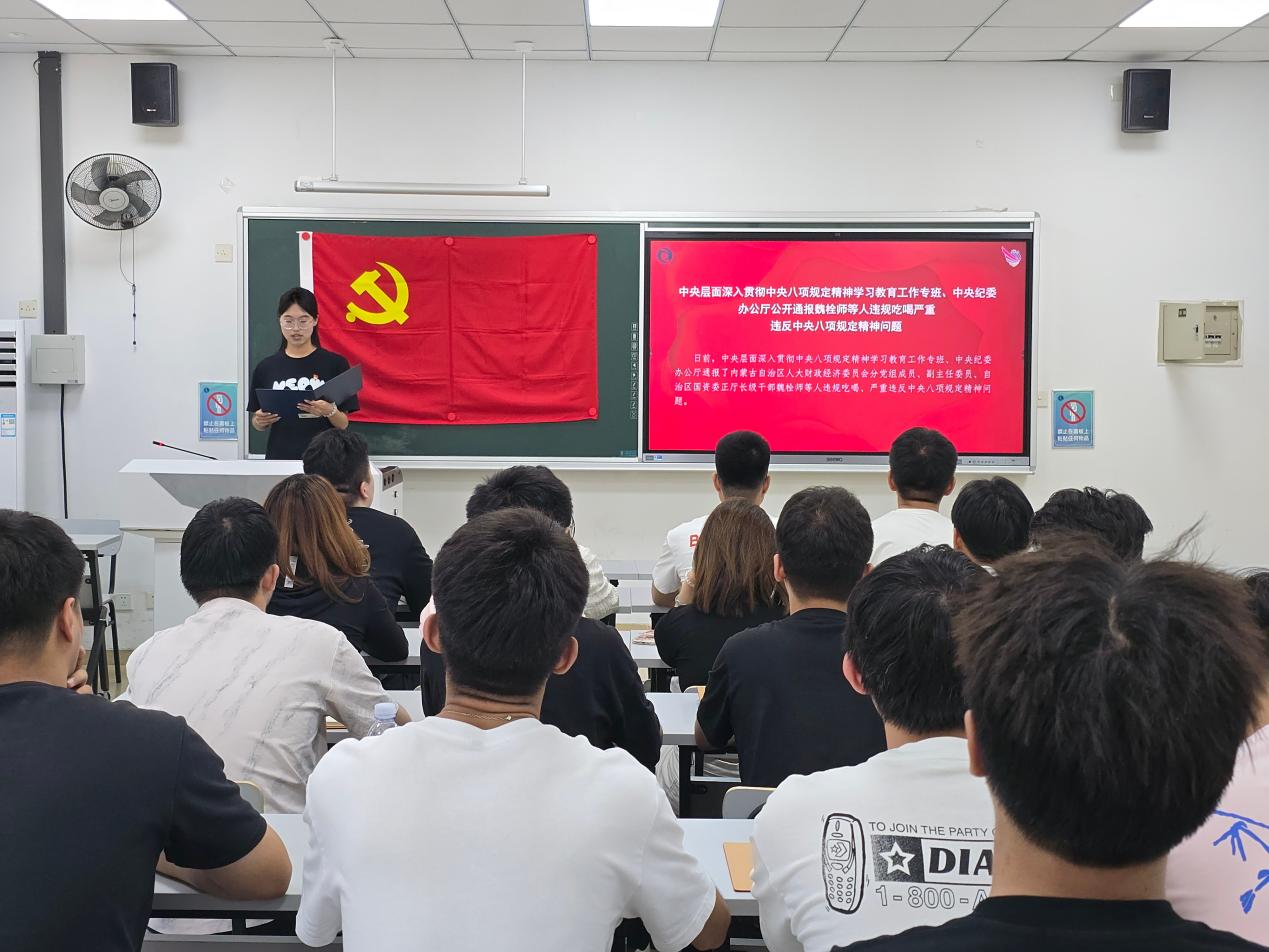 随后,支部组织观看专题影片《从“一根灯芯”到“八项规定”独家解读|中央八项规定精神》,通过历史脉络与现实案例的双重对照,深刻剖析违规吃喝问题的政治危害与纪律底线。会议强调,作为学生党员,要从案例中切实筑牢思想防线:一要严守中央八项规定精神,坚决抵制“吃喝歪风”,在校园社交中明晰公与私的边界;二要强化政治意识和纪律自觉,杜绝侥幸心理,对违规宴请保持“零参与”的清醒认知;三要以清正作风为行为准则,将纪律要求内化为日常言行,在学生群体中树立廉洁自律的先锋形象,以实际行动守护党员队伍的先进性与纯洁性。