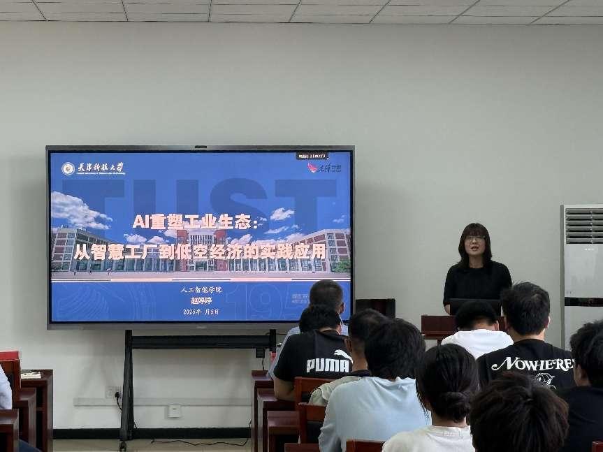 论坛邀请到人工智能学院副院长赵婷婷教授、电子信息与自动化学院林丽媛博士以及机械工程学院的张沛森博士、任维佳博士,分别做了“AI重塑工业生态:从智慧工厂到低空经济的实践应用”“AI技术融合与应用探索”“人工智能在医疗诊断中的应用”“复杂环境下的纺品不确定性分析及光谱分类决策机制研究”等主题的报告。每位专家的报告都紧扣“机”与“智”的融合主题,聚焦当前前沿方向,内容丰富,视野开阔,引发了与会师生的热烈讨论。