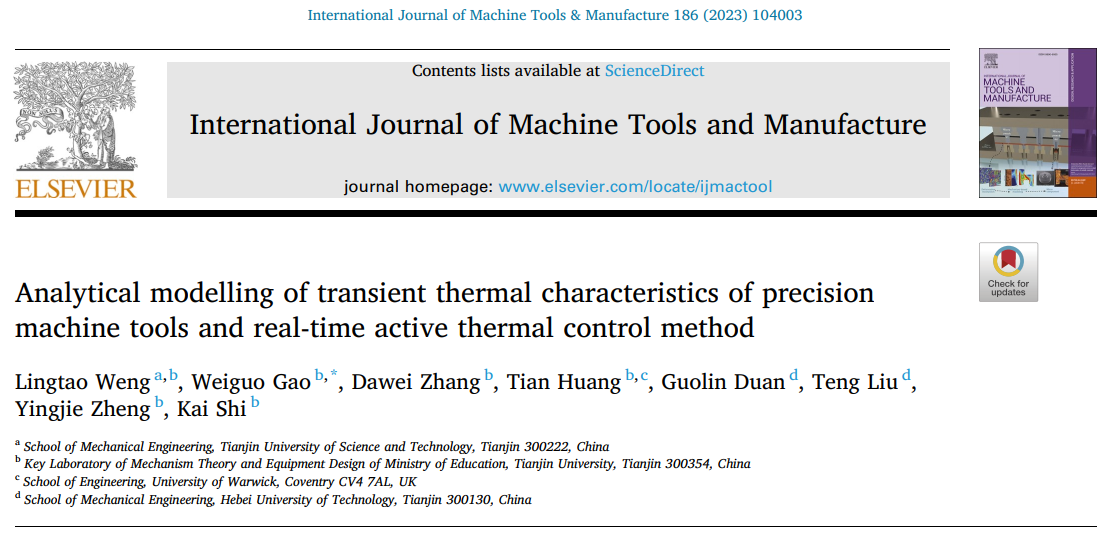 Weng L, Gao W*, Zhang D, Tian Huang, Guolin Duan, Teng Liu, Yingjie Zheng, Kai Shi. Analytical modelling of transient thermal characteristics of precision machine tools and real-time active thermal control method[J]. International Journal of Machine Tools and Manufacture, 2023: 104003.