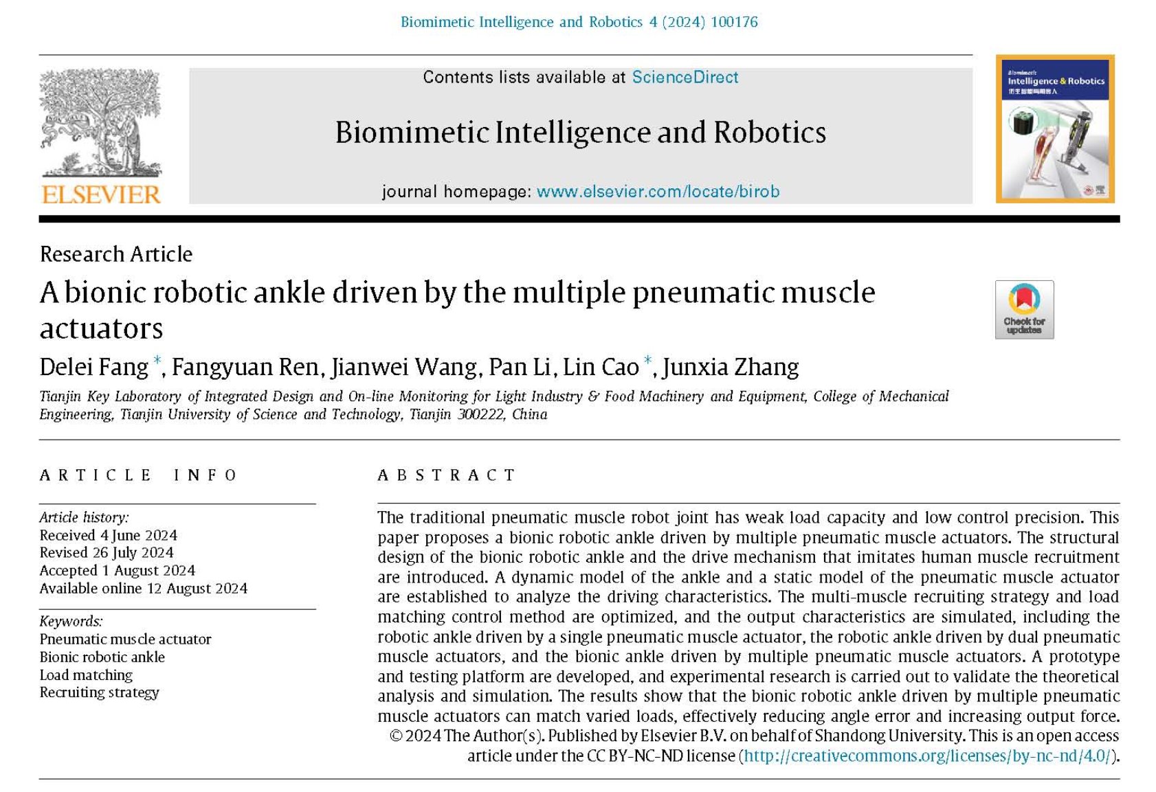 近日,机械工程学院青年教师房德磊所在服务机器人与仿生设计团队,在中国科技期刊卓越行动计划《Biomimetic Intelligence and Robotics》期刊发表封面文章,题为《A bionic robotic ankle driven by the multiple pneumatic muscle actuators》,该团队在人工肌肉驱动控制方面取得了创新性科研成果。