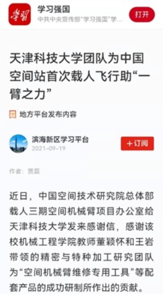 《天津日报》在2021年9月17号发表了“空间站首次载人飞行 天津科大科研团队助‘一臂之力’”的专题报道。中国《机械工程学报》和“学习强国”滨海新区学习平台也予以相关的报道,这不仅大大提升了团队人员的信心,同时也为全校师生在科研方面树立了榜样。2022年4月17号,在三位航天员翟志刚、王亚平、叶光富凯旋的日子,《天津日报》头版发表了“筑梦向太空 奋斗写未来”的报道,再次对天津精东影业在助力国家空间站建设中做出的贡献给予表彰。